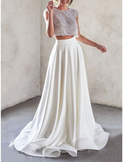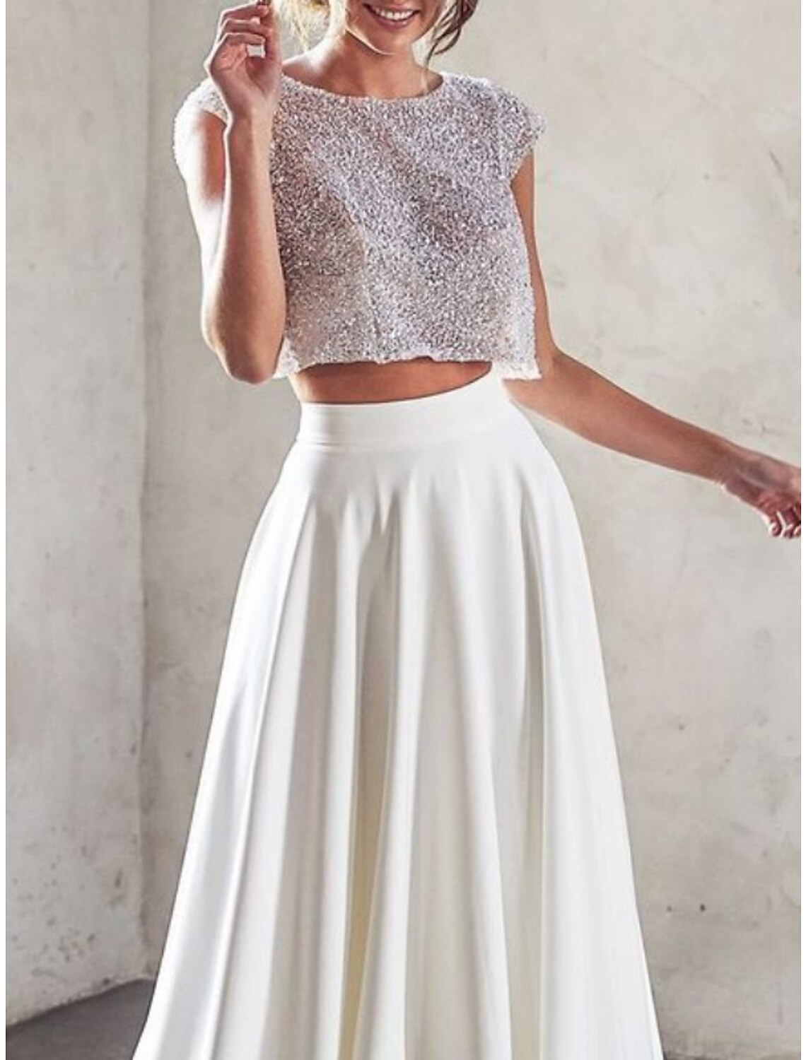 Beach Sparkle & Shine Wedding Dresses A-Line Scoop Neck Cap Sleeve Sweep / Brush Train Sequined Bridal Gowns With Pleats - US 2 / UK 6 / EU 32