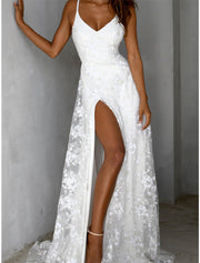 Beach Wedding Dresses A-Line Camisole V Neck Spaghetti Strap Court Train Lace Bridal Gowns With Appliques Split Front