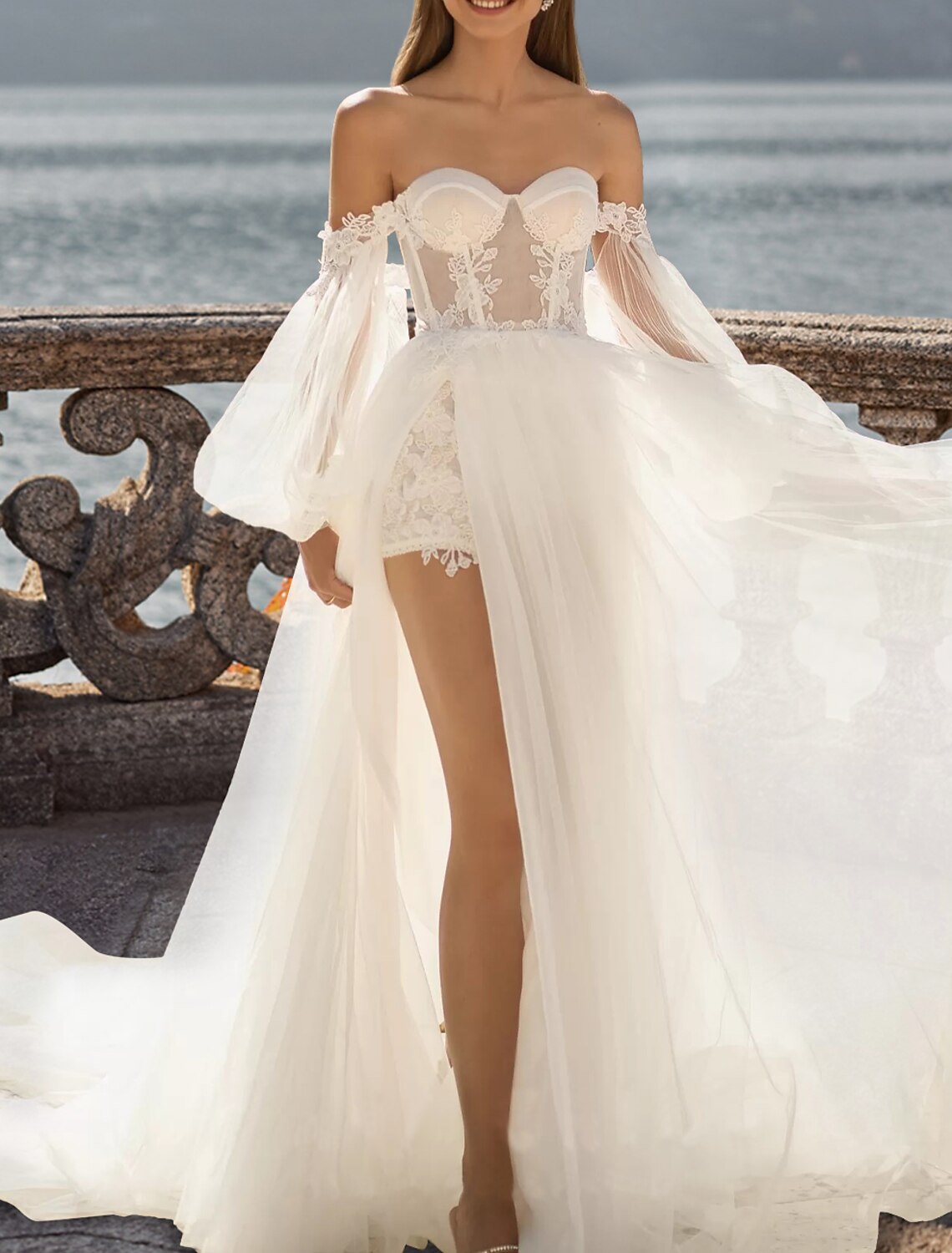 Beach Wedding Dresses A-Line Off Shoulder Long Sleeve Court Train Lace Bridal Gowns With Appliques Split Front