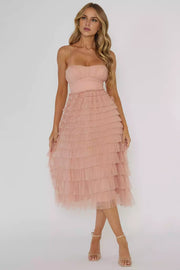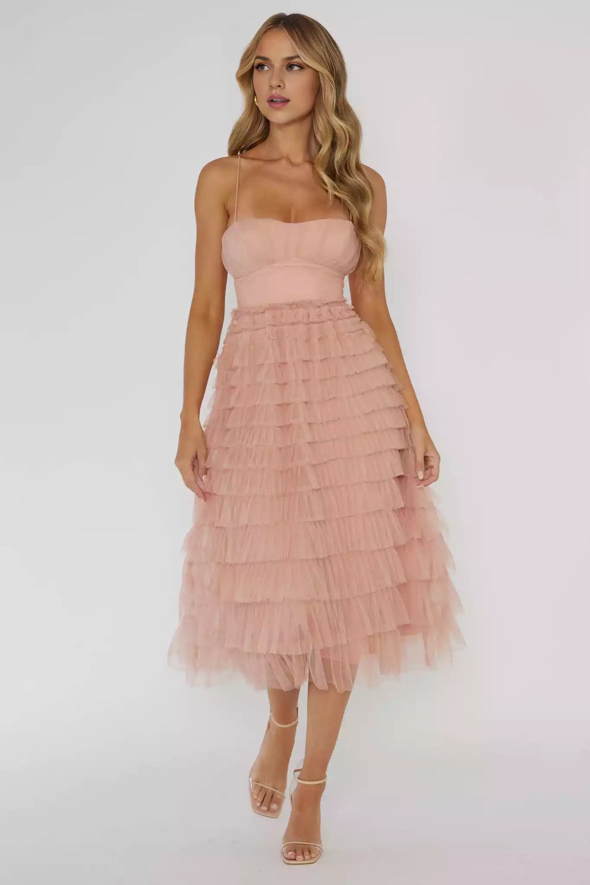 Beautiful mid length fully lined layered ruffle detail strap, with a zipper at the back of the back strap Prom Dresses