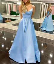 Blue A-Line V-Neck Ruched Bodice Spaghetti Straps Satin Prom Dresses
