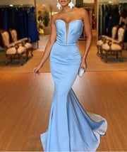 Blue Sweetheart Plunging Strapless Mermaid Ruched Bodice Prom Dresses