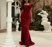 Burgundy Long Mermaid / Trumpet Prom Dresses With Ruffle Shoulder