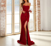Burgundy Long Strapless Mermaid Prom Dress With Slits Up The Side