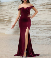 Burgundy Women's Velvet Off The Shoulder Mermaid Prom Dresses Formal Gowns