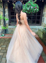 Champagne Strapless Sweetheart Pleated Bodice Tulle Long Prom Dresses