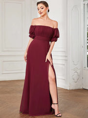 Chiffon Shirred Off-Shoulder High Slit Evening Dress