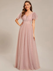 Custom Size Ruffled Sleeves Deep V-neck A-line Tulle Prom Dress