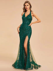 Custom Size Sequins Halter Neck Bodycon Mermaid Prom Dress with Back Lace-Up