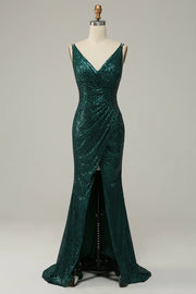 Dark Green Sequined Spaghetti Straps Prom Dress With Slit