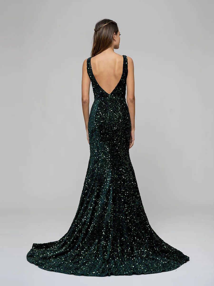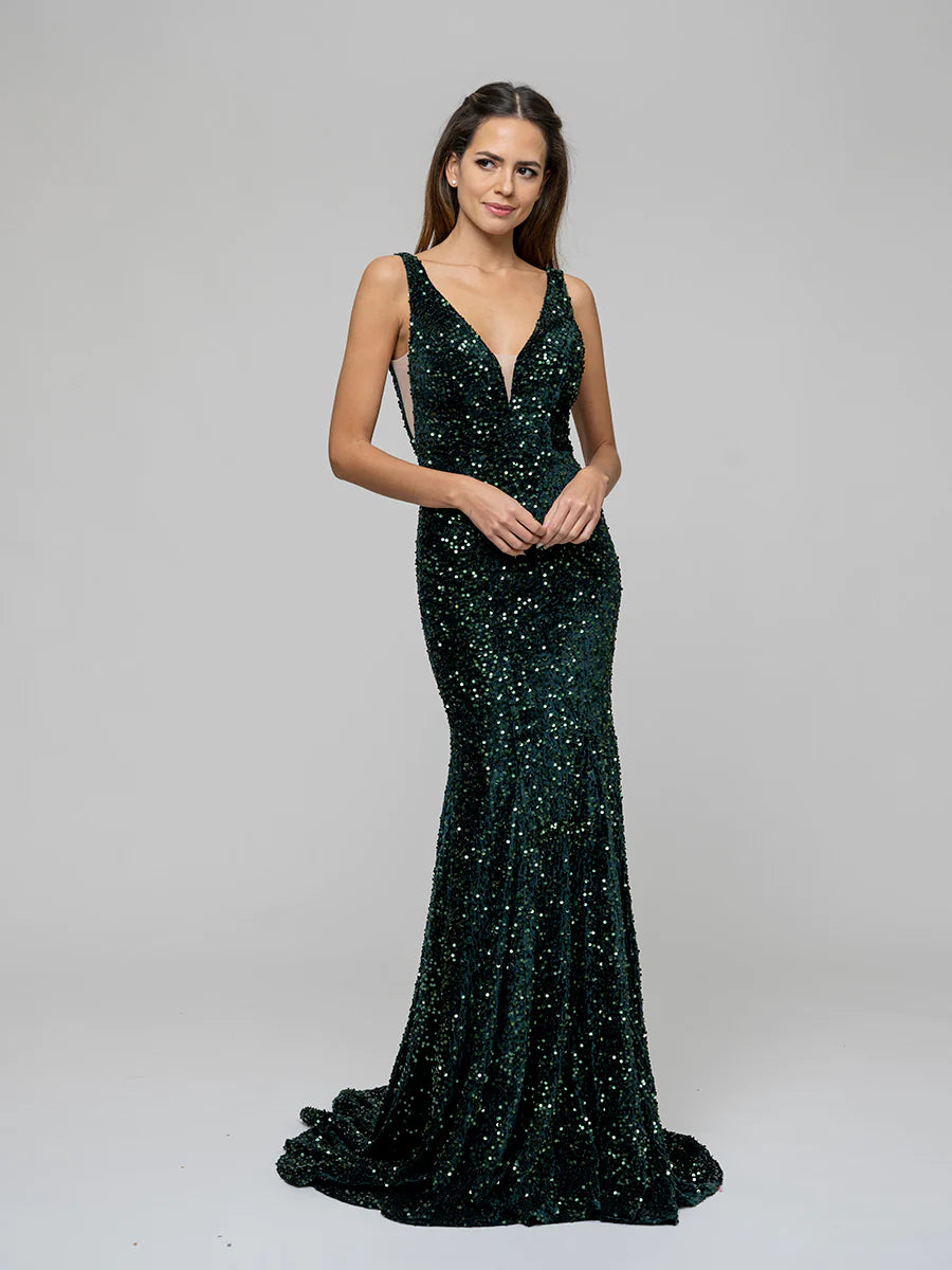 Deep V-neck Velvet Sequin Sheath Prom Dresses With Sweep Train