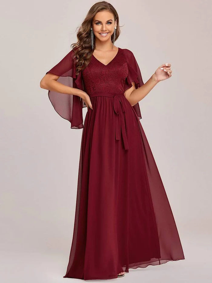 Elegant Maxi V Neck Chiffon Wedding Guest Dress with Sleeves - Burgundy