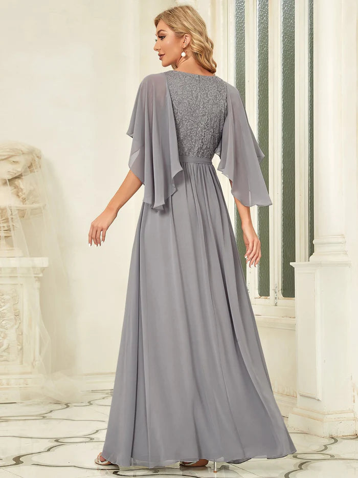 Elegant Maxi V Neck Chiffon Wedding Guest Dress with Sleeves