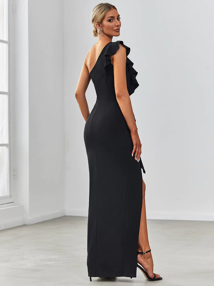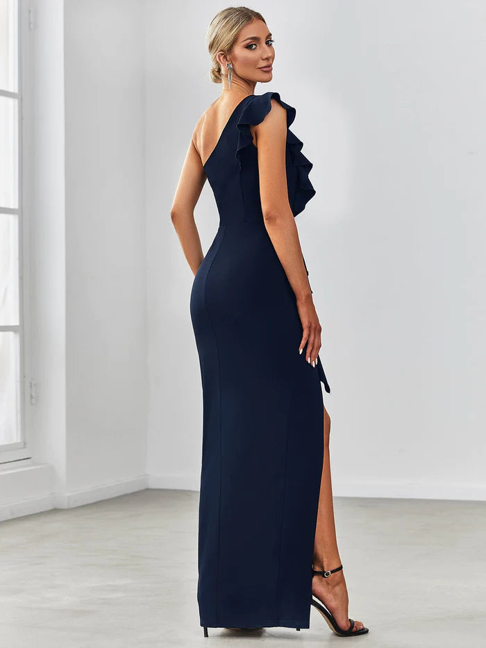 Elegant One Shoulder Slit High Stretch Evening Dress with Ruffles
