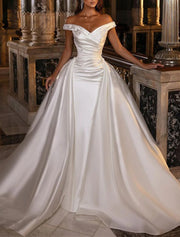 Engagement Formal Wedding Dresses Ball Gown Off Shoulder Cap Sleeve Chapel Train Satin Bridal Gowns With Ruched Flower
