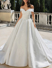 Engagement Formal Wedding Dresses Ball Gown Off Shoulder Cap Sleeve Chapel Train Satin Bridal Gowns With Solid Color