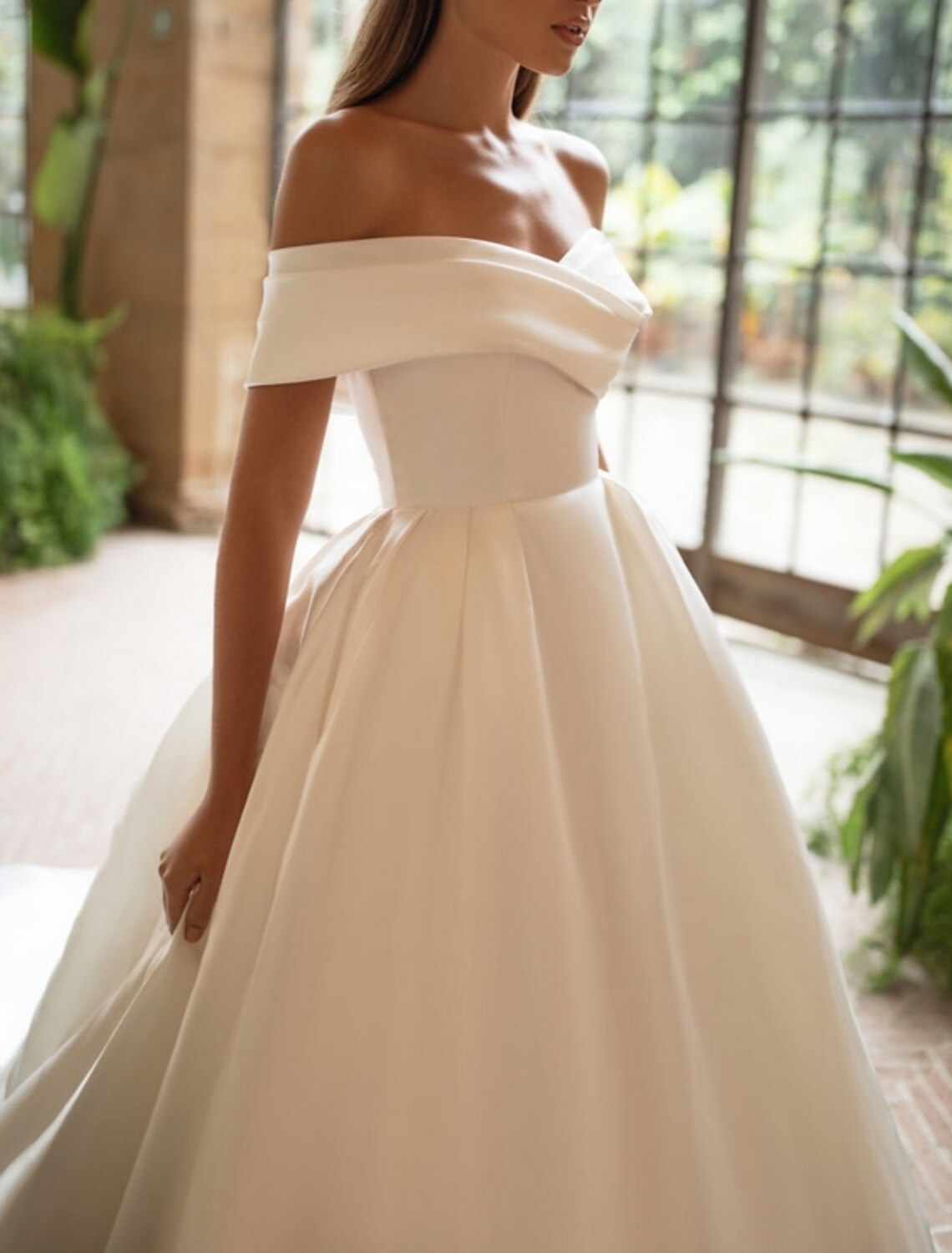 Engagement Formal Wedding Dresses Ball Gown Off Shoulder Cap Sleeve Court Train Satin Bridal Gowns With Ruched