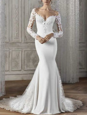 Engagement Open Back Formal Wedding Dresses Mermaid / Trumpet V Neck Long Sleeve Court Train Satin Bridal Gowns With Beading Lace Insert - US 2 / UK 6 / EU 32