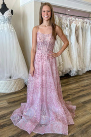 Glitter Sequin Lace Spaghetti Strap A-Line Long Prom Dress
