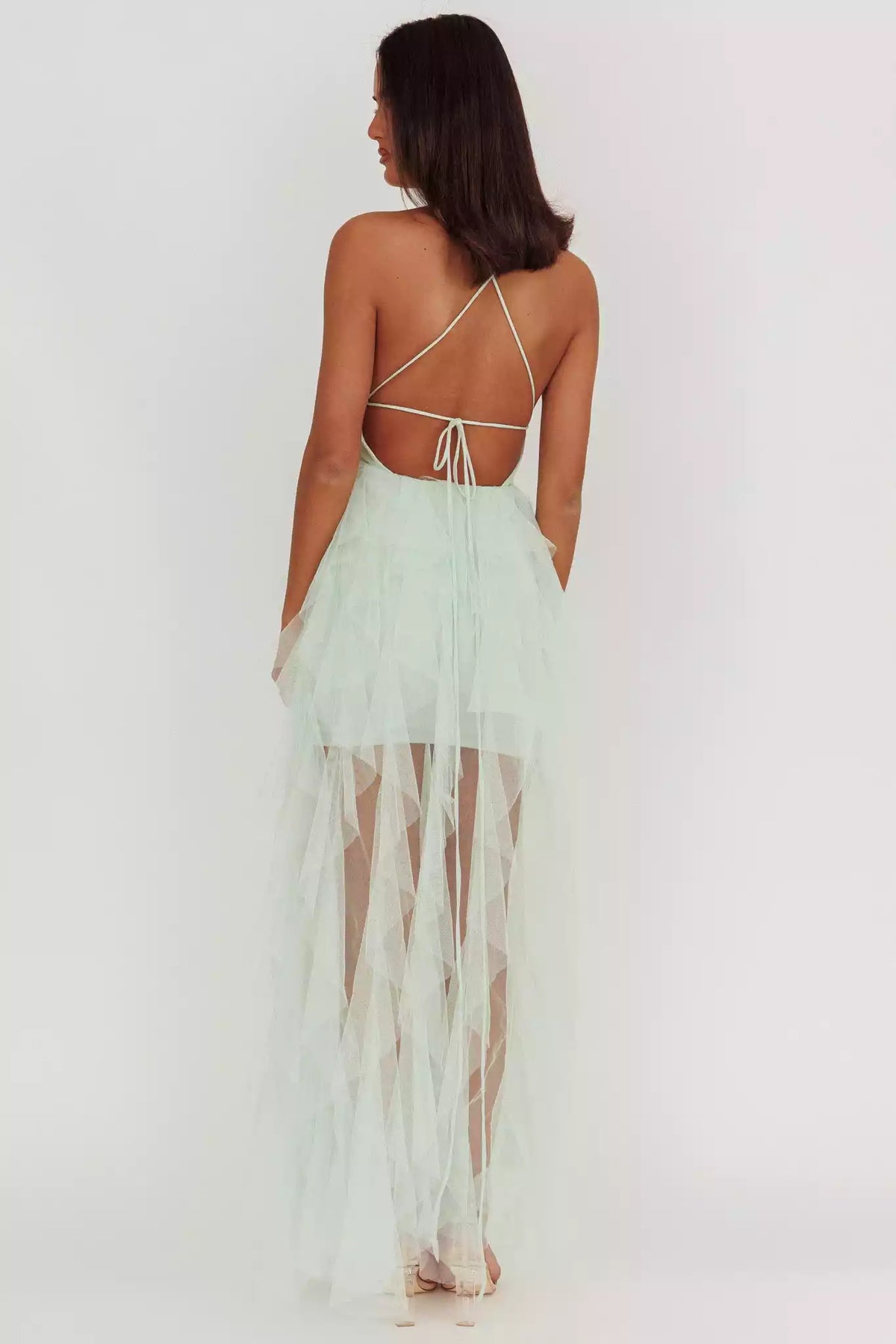 Gorgeous lining with layered ruffle edges, backless lace up, back with zipper Prom Dresses