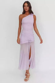 Gorgeous lining with single shoulder pleat details, rose embellishment, slit, see through hem, zipper on the side, Prom Dresses