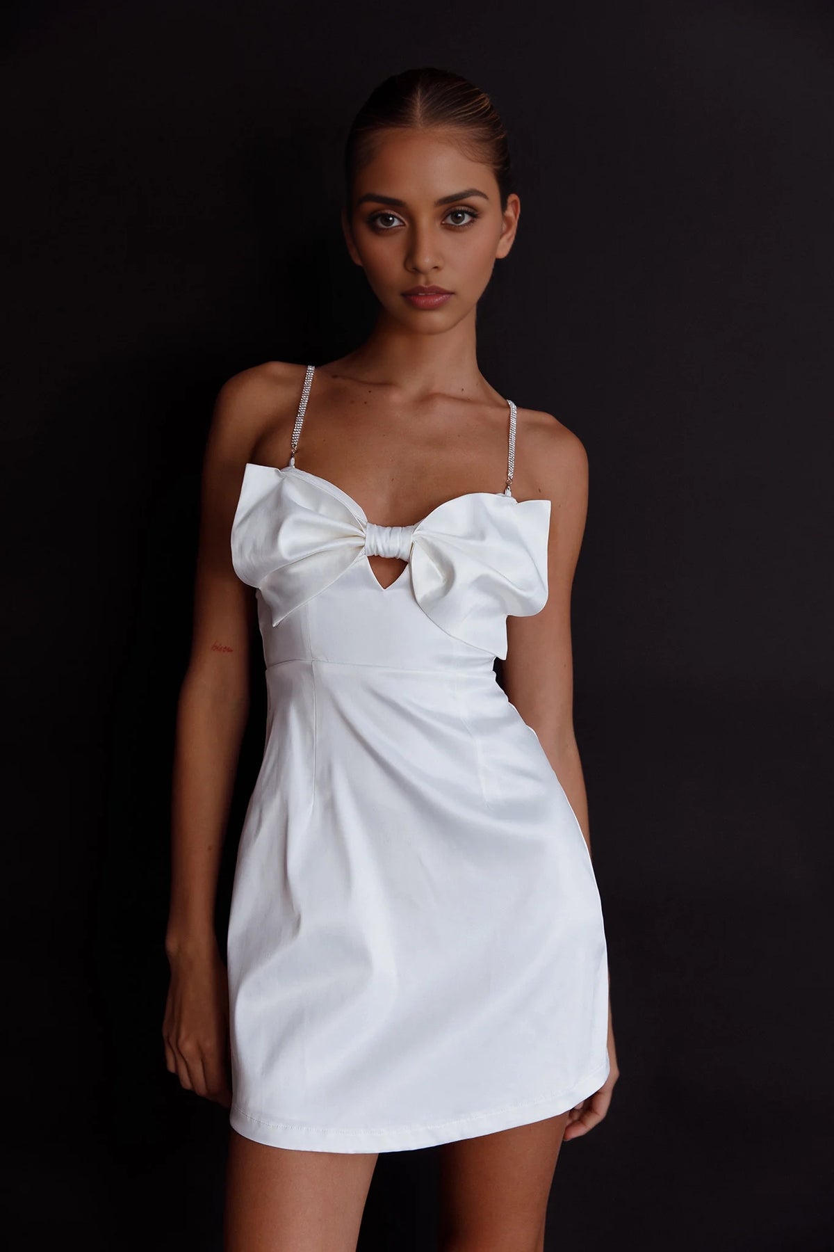Gorgeous satin mini bow with adjustable diamond shoulder straps and zipper at the back Homecoming Dresses