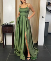Green A-Line Long Satin Split Front Prom Dress With Criss-Cross Straps - US 2 / UK 6 / EU 32