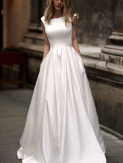 Hall Casual Wedding Dresses A-Line Scoop Neck Cap Sleeve Court Train Satin Bridal Gowns With Pleats Summer Fall Wedding Party , Women's Clothing