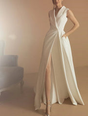 Hall Casual Wedding Dresses A-Line V Neck Sleeveless Floor Length Satin Bridal Gowns With Split Front