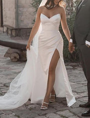 Hall Casual Wedding Dresses Sheath / Column Sweetheart Strapless Sweep / Brush Train Satin Bridal Gowns With Split Front