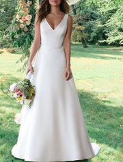 Hall Open Back Casual Wedding Dresses A-Line V Neck Sleeveless Sweep / Brush Train Satin Bridal Gowns With Appliques