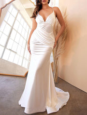 Hall Open Back Casual Wedding Dresses Mermaid / Trumpet Camisole V Neck Spaghetti Strap Court Train Stretch Fabric Bridal Gowns With Solid Color