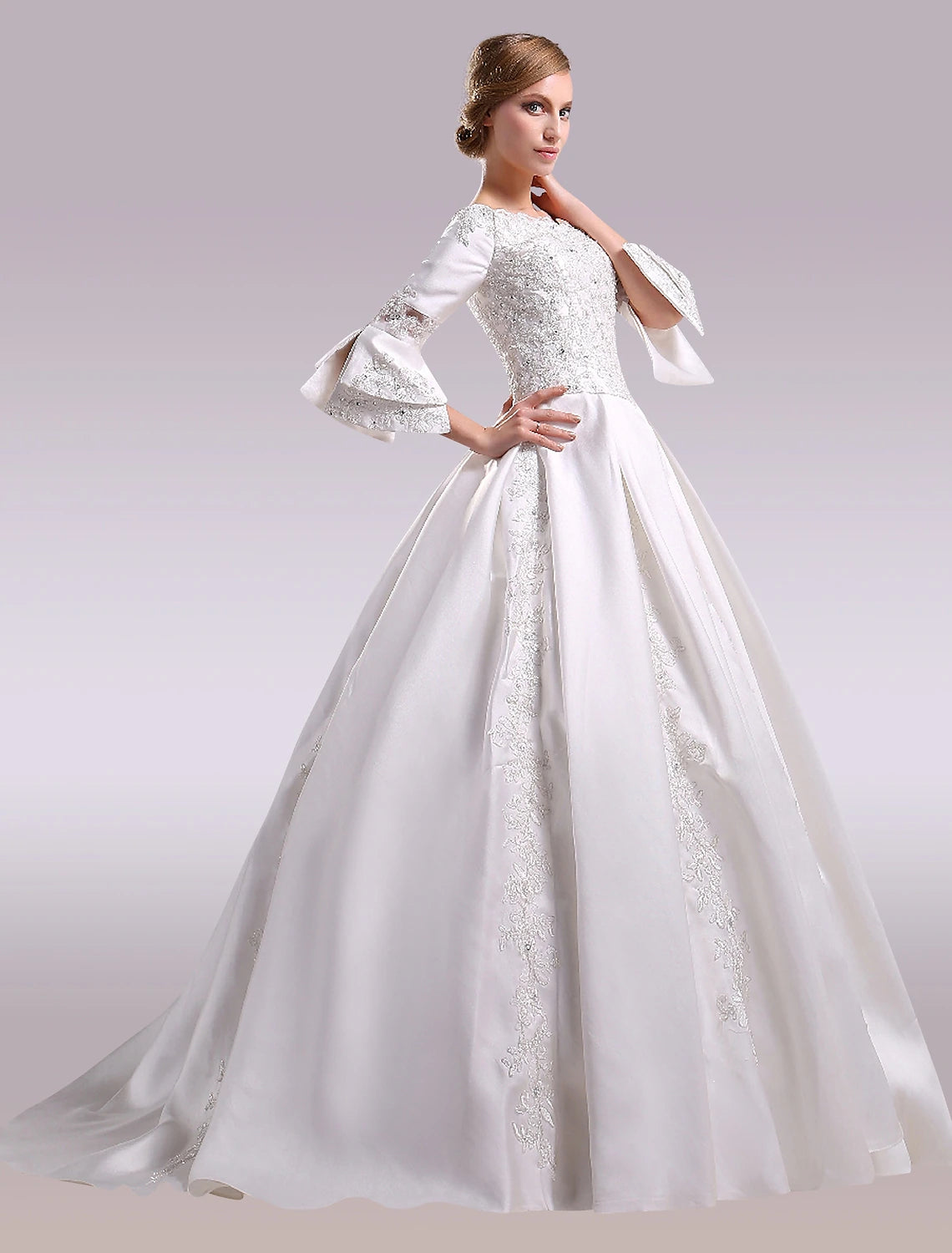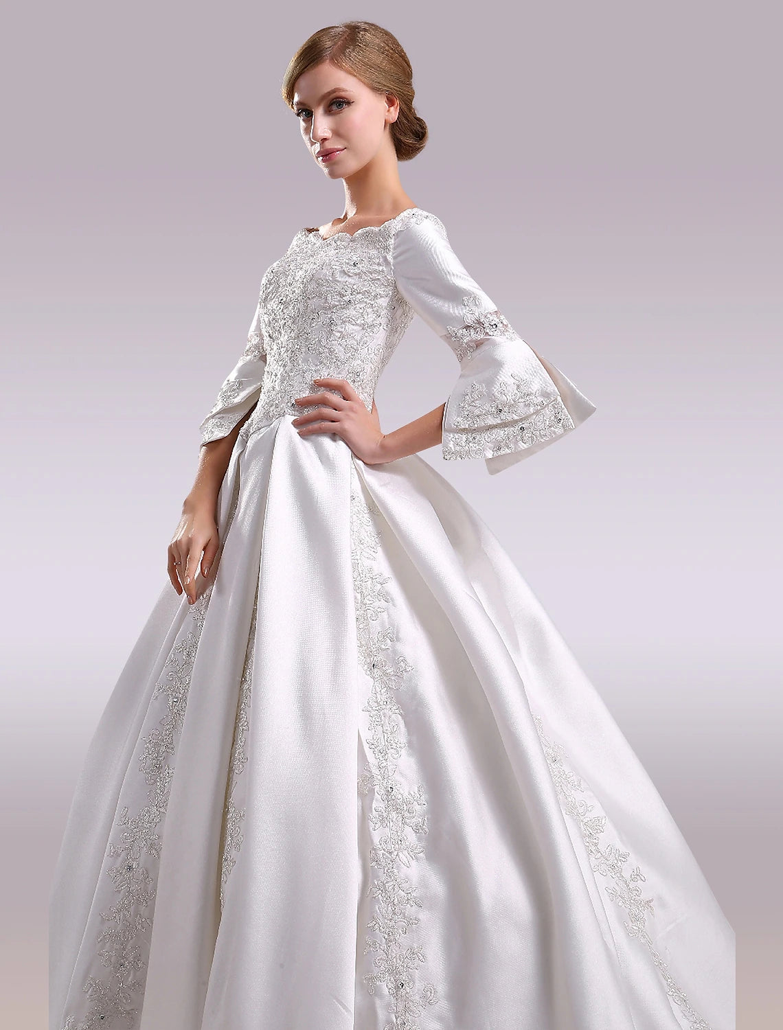 Hall Wedding Dresses A-Line Off Shoulder Long Sleeve Chapel Train Satin Bridal Gowns With Lace Beading
