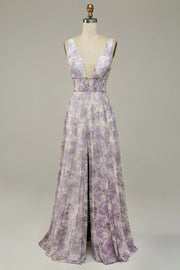 Iovry Purple Printed V-Neck Prom Dress With Slit