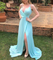 Jade Ruched V Neck Bodice Spaghetti Straps Long Prom Dress With Split