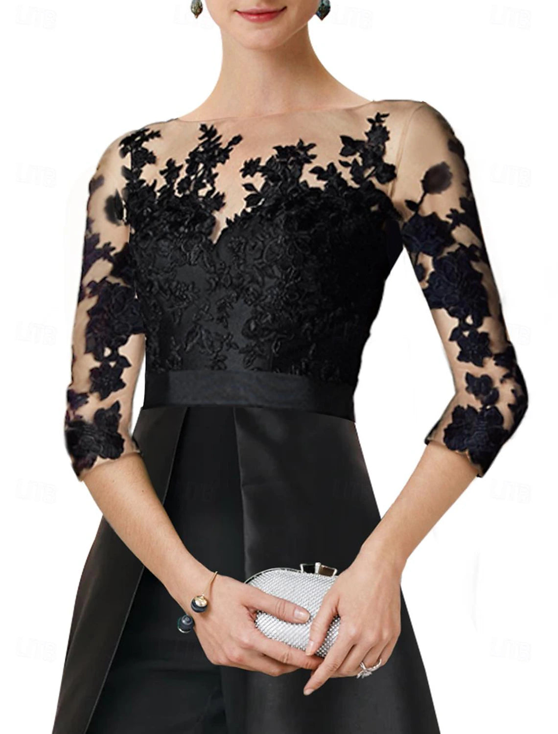Jumpsuits Mother of the Bride Dress Wedding Guest Elegant Party Jewel Neck Floor Length Satin 3/4 Length Sleeve with Appliques Solid Color - US 2 / UK 6 / EU 32
