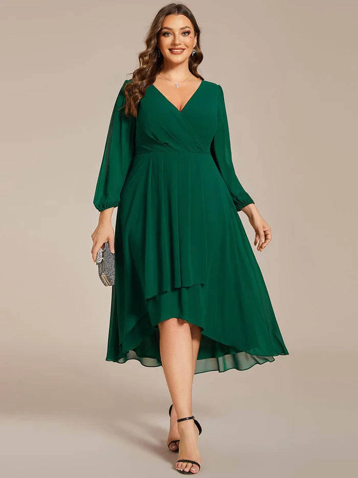 Elegant Long Sleeve V-Neck High Low Chiffon Wedding Guest Dress
