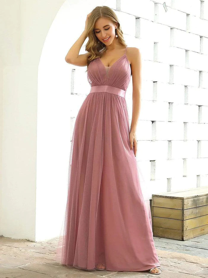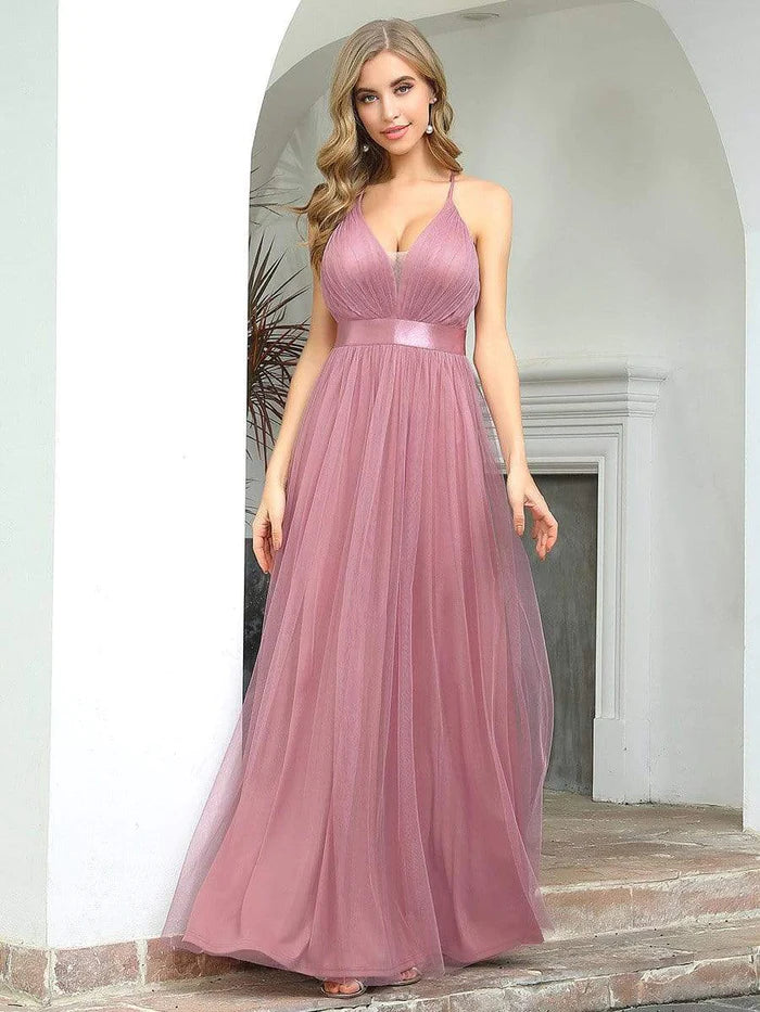 Sexy Deep V-neck Backless Tulle Maxi Evening Dresses