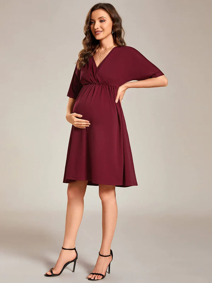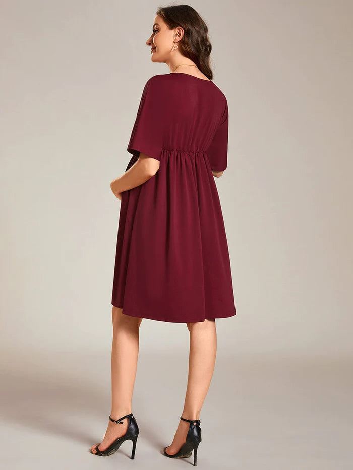 Loose V-Neck Half Sleeve Knee Length Maternity Dress - Burgundy