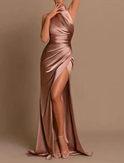Mermaid Dress Evening Gown Satin Wedding Dress Halter Neck Red Green Dress High Split Wedding Sweep / Brush Train Sleeveless Bridesmaid Dress With Pleats - Dusty Rose