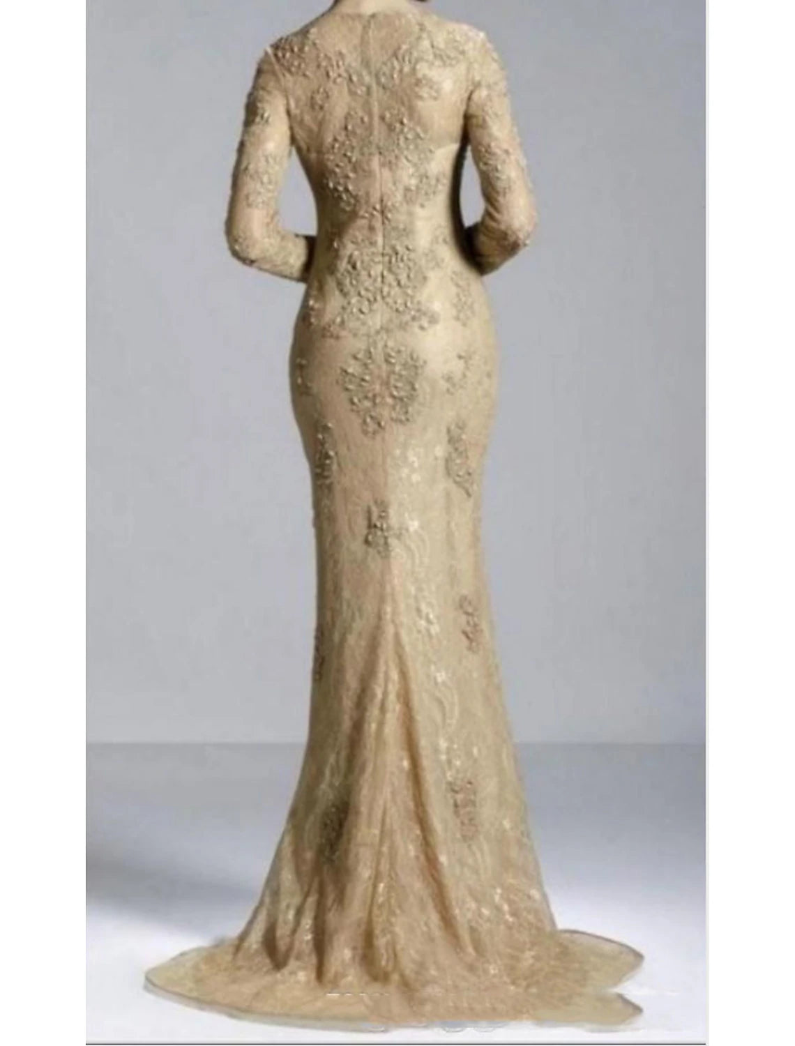 Mermaid Party Dress Evening Gown Luxurious Dress Engagement Formal Evening Sweep / Brush Train Long Sleeve Jewel Neck Fall Wedding Guest Lace with Beading Appliques - Khaki
