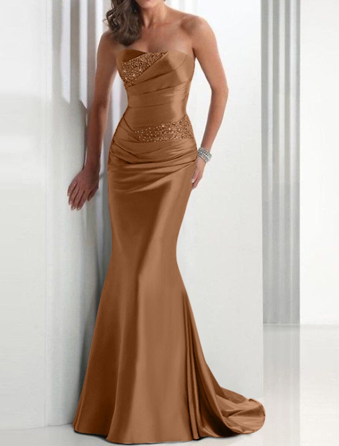 Mermaid / Trumpet Elegant Sparkle & Shine Wedding Guest Formal Evening Dress Strapless Sleeveless Sweep / Brush Train Satin with Crystals