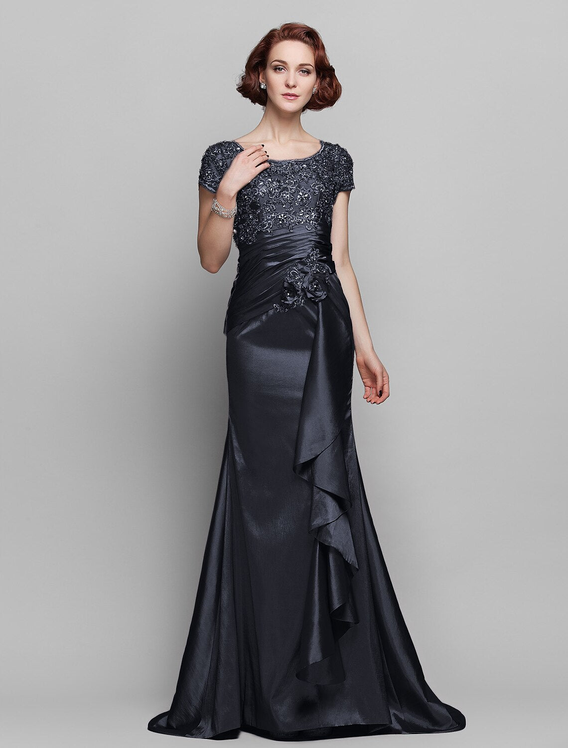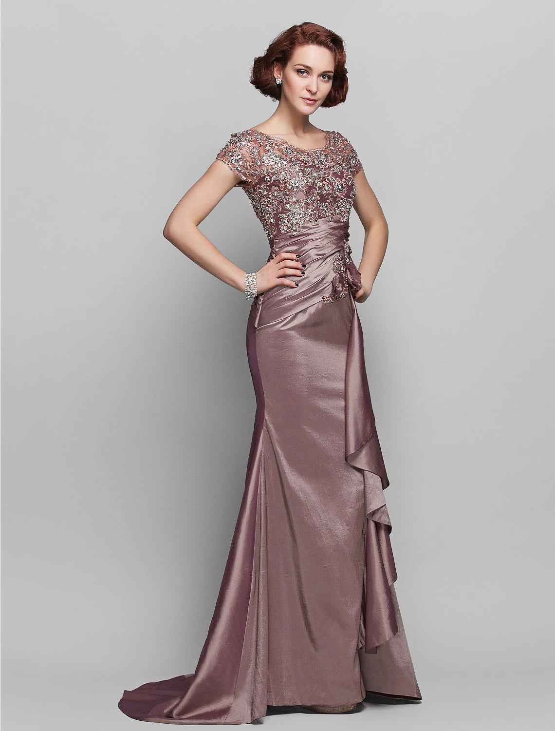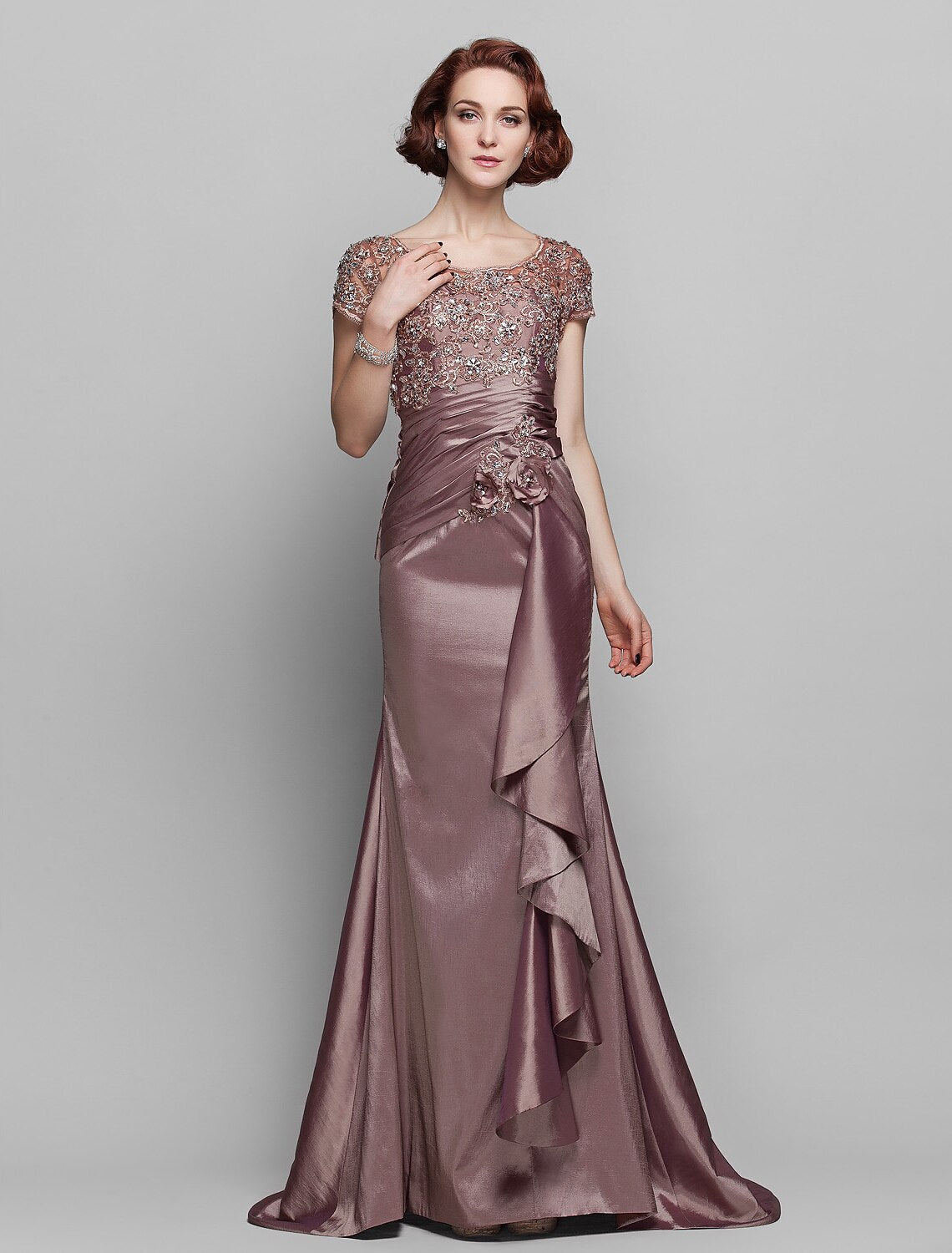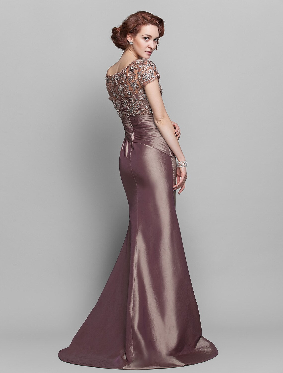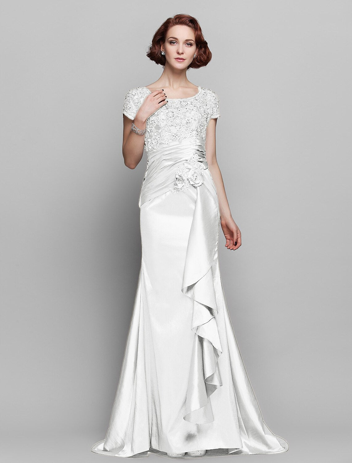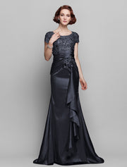 Mermaid / Trumpet Mother of the Bride Dress See Through Scoop Neck Sweep / Brush Train Taffeta Beaded Lace Short Sleeve with Flower