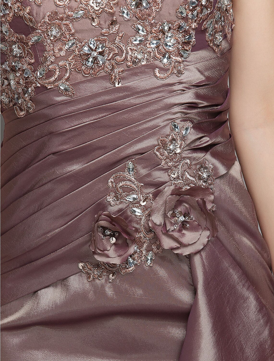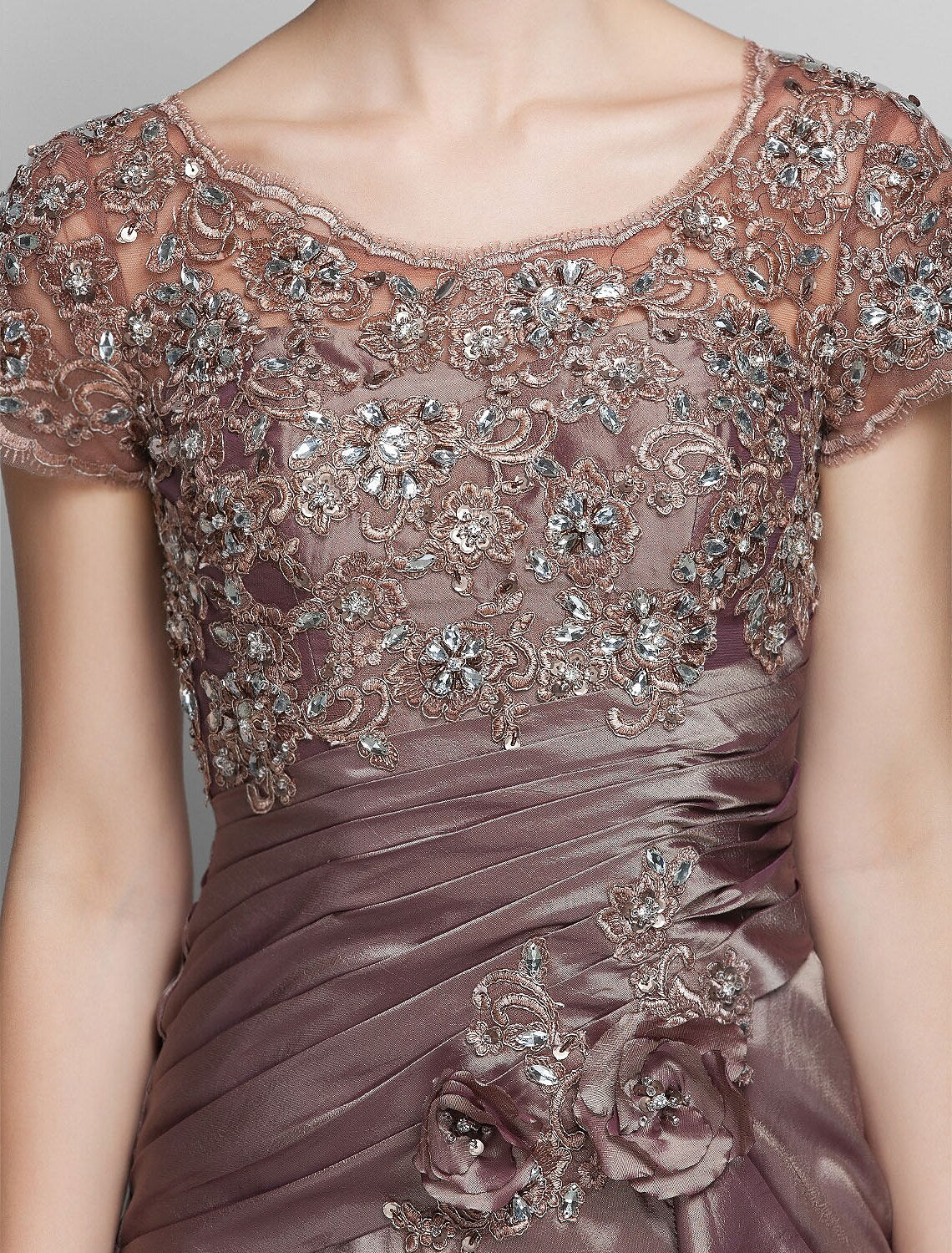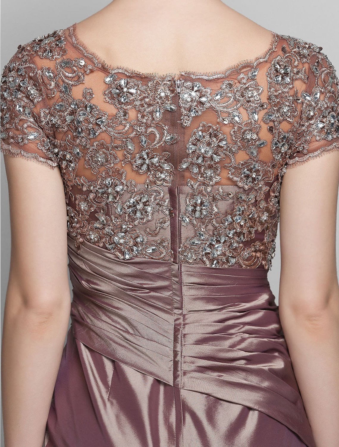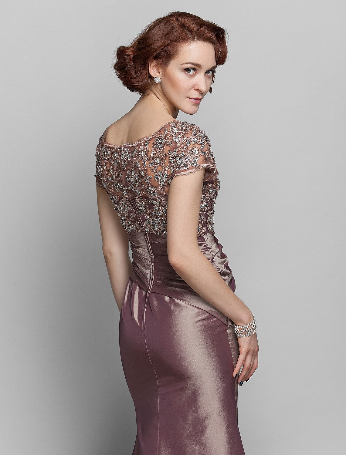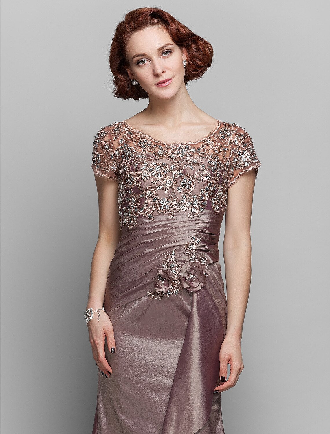 Mermaid / Trumpet Mother of the Bride Dress See Through Scoop Neck Sweep / Brush Train Taffeta Beaded Lace Short Sleeve with Flower
