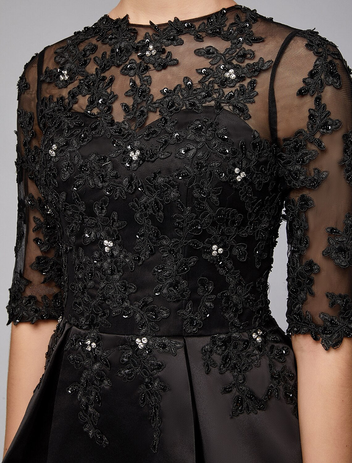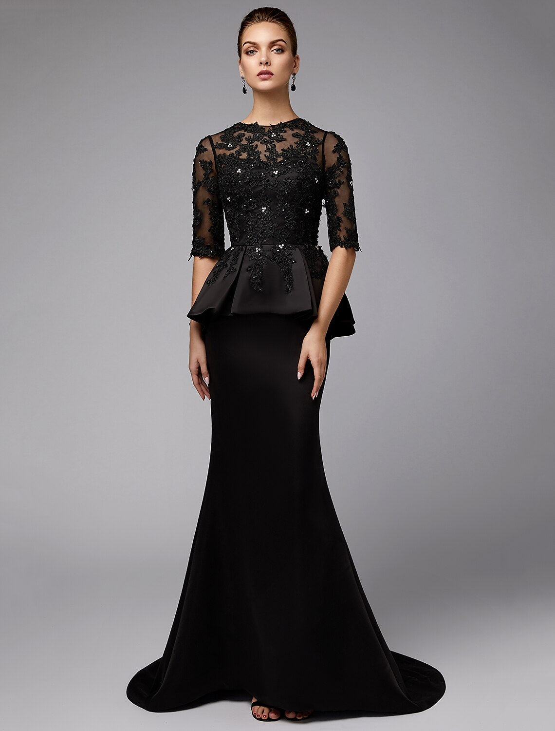Mermaid / Trumpet Mother of the Bride Dress Sexy See Through Jewel Neck Sweep / Brush Train Satin Lace Half Sleeve with Beading Appliques - US 2 / UK 6 / EU 32