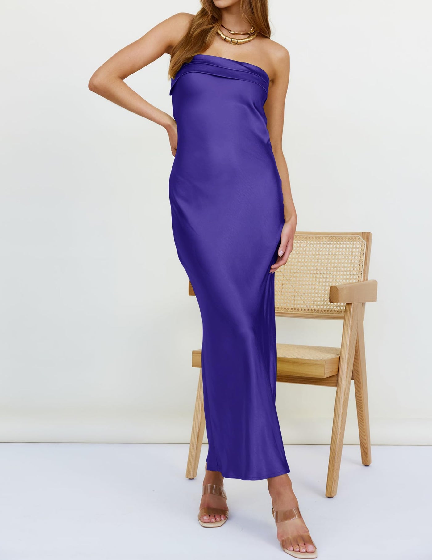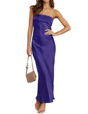 Navy Strapless Satin Tube Bodycon Backless Formal Prom Dress