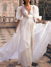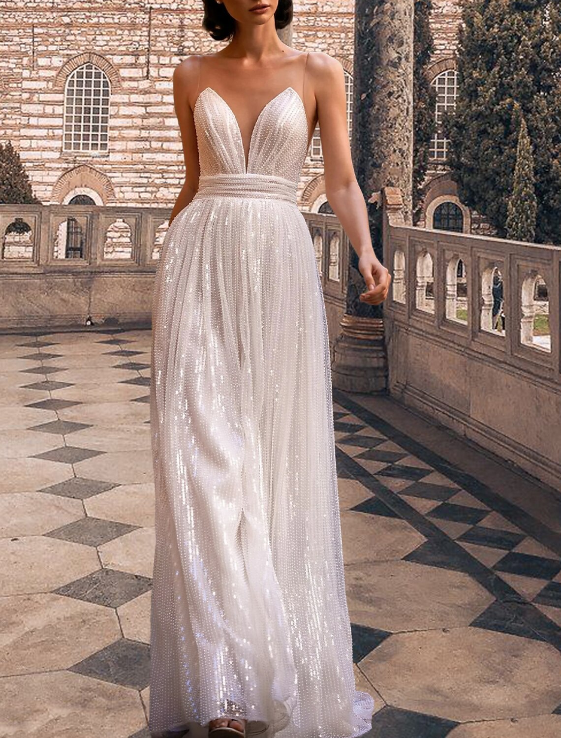 Open Back Glitter & Sparkle Wedding Dresses Two Piece Illusion Neck Scoop Neck Long Sleeve Floor Length Organza Bridal Suits Bridal Gowns With Ruched - US 2 / UK 6 / EU 32