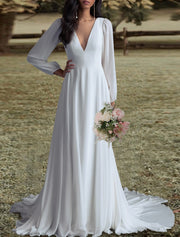 Open Back Wedding Dresses A-Line V Neck Long Sleeve Sweep / Brush Train Chiffon Bridal Gowns With Pleats