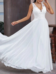 Open Back Wedding Dresses A-Line V Neck Sleeveless Floor Length Chiffon Bridal Gowns With Appliques