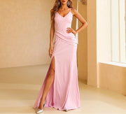 Pink Sheath Long V-Neck Spaghetti Straps Split Front Prom Dresses